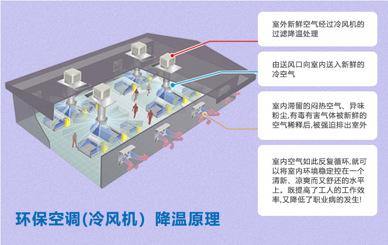 研究表明,舒適的工作環(huán)境可以提高生產(chǎn)力,有效的降低員工操作時(shí)的錯(cuò)誤率,以及怠工情緒。環(huán)??照{(diào)(冷風(fēng)機(jī))可以在炎熱的天氣中提供有效的通風(fēng)降溫解決方案,創(chuàng)造舒適良好的生產(chǎn)環(huán)境。